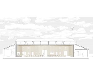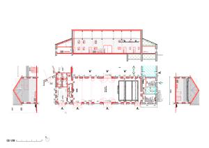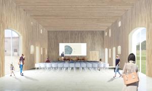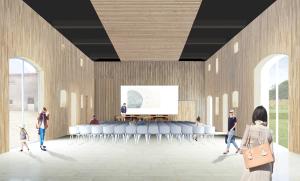 Les aménagements successifs de l’ancien corps de ferme et de ses annexes ont conduits à des découpages complexes. Grâce à une purge complète des cloisonnements divers et à l’ouverture des murs de refends, l’ensemble du volume de l’ancien corps de ferme est dégagé pour offrir un espace polyvalent généreux (250 places). Cette salle de réception est entièrement habillée en lames de frêne de provenance locale, ajourées pour l’acoustique du lieu.