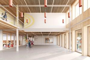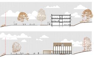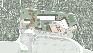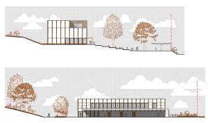 Le deuxième enjeu est paysager. Considérer le site comme un atout exceptionnel, en termes de qualité de vie pour les utilisateurs, est primordial. Le projet tire profit de ses atouts (topographie, ensoleillement, échappées visuelles, proximité de la forêt, potentiel en matière d’infiltration des eaux de pluie, îlots de fraicheur) pour intensifier le lien entre le collège et son paysage alentour ; désimperméabilisation d’une partie des sols, création de terrasses-belvedères au deuxième étage de l’externat, préservation des arbres et végétaux existants, création de jardins à thème (pédagogiques, de sous-bois, de lecture…). L’épisode COVID a aussi démontré l’importance de pouvoir disposer d’espaces extérieurs à proximité des lieux d’enseignement.