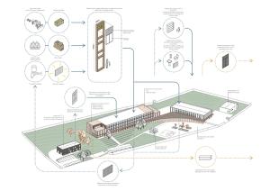 Le troisième enjeu est patrimonial. Puisque l’histoire de ces constructions est intimement liée à celle de l’histoire locale et en particulier de la sidérurgie, comment valoriser un ouvrage, à l’esthétique sans doute impopulaire, qui témoigne aussi explicitement de l’histoire locale et participe à la mémoire collective ? Pour cela nous proposons de valoriser les structures des bâtiments existants et de réinterpréter le principe de façades « Fillod » par des caissons préfabriqués en bois et paille formant une nouvelle enveloppe performante. Nous proposons une réutilisation des éléments des vêtures d’origine, restaurés et disposés, de manière légèrement inclinée sur ces caissons. Un clin d’œil aux constructions à « paroi inclinée » breveté par Ferdinand Fillod, un acte de réemploi et globalement une manière de modifier l’aspect extérieur du bâtiment tout en restant fidèle à son architecture d’origine.