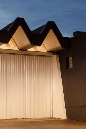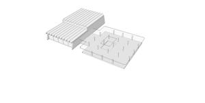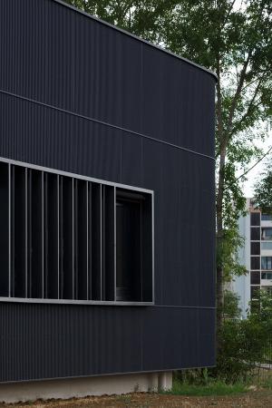 - Une nouvelle façade. Une nouvelle façade est donnée au bâtiment. Cette façade réalisée en ossature bois vient s’appuyer sur les débords de toiture existants. Elle permet l’extension de la médiathèque tout en assurant la suppression de tous les ponts thermiques du bâtiment existant. Véritable manteau, cette façade enveloppe le bâtiment, tout en composant avec son histoire. Elle enveloppe également l’extension. Cette façade technique résout un grand nombre de problèmes posés par le projet. Le carneau périphérique installé permet le passage de l’ensemble des réseaux de chauffage et de ventilation, sans jamais venir perturber la toiture en caissons mise au point par André et Prouvé. L’architecture du bâtiment d’origine est ainsi valorisée par ce qu’elle avait de plus évident; sa structure primaire.