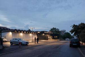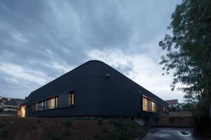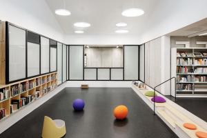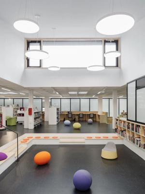 - Une extension. Construite sur la partie avant du bâtiment existant, cette extension permet de gérer l’entrée de la médiathèque, tout en résolvant la problématique de l’accessibilité. En effet, à la jonction entre existant et neuf, une rampe est créée. Véritable promenade architecturale cette rampe est l’accès pour tous les utilisateurs. Baignée de lumière, elle dessert les différents bureaux situés sur la rue de l’Asnée, ainsi que la salle de présentation des ouvrages.