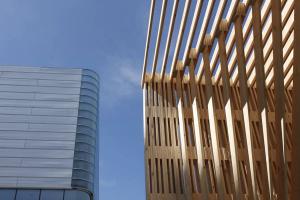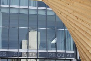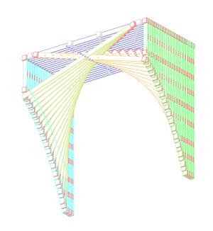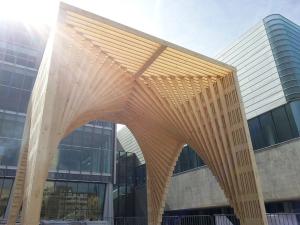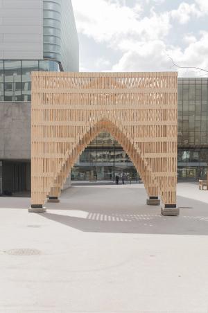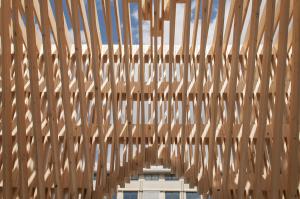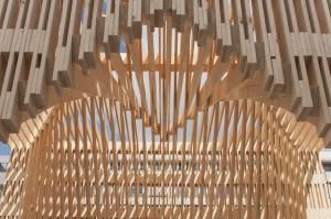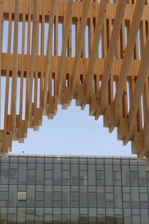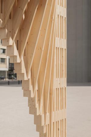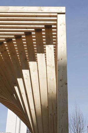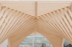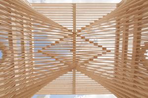 La structure est uniquement composée de planches vissées sur le principe d'une maille dense afin de répartir les efforts dans l'ensemble de la charpente. Les arbalétriers horizontaux et les poteaux verticaux sont réguliers et alignés mais les entraits sont progressivement décalés pour supporter les différents efforts de triangulation. Ces décalages créent également une structure d'arcs et de croix ayant l’intérêt de contreventer les 3 plans principaux de l'édifice: latéral, longitudinal et plan de toiture. Aucune croix de St André ou panneau de contreventement rapporté n'est nécessaire.