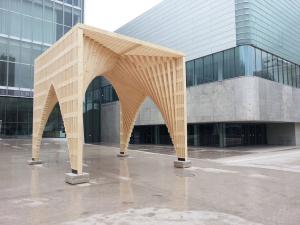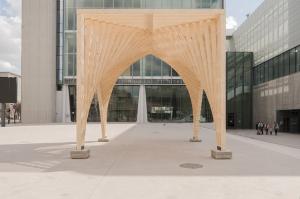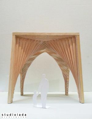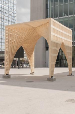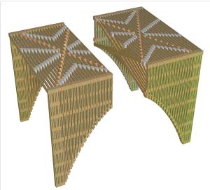 La structure proposée est un cube de 5m de côté : dimension maximum raisonnable d’une planche de bois massif. Ce cube est ensuite creusé de l’intérieur et se pose délicatement sur quatre pieds affinés. La charpente apparaît comme une masse de bois organique, uniforme qui s’affranchit de la hiérarchie habituelle : poteaux / entrait / arbalétrier.