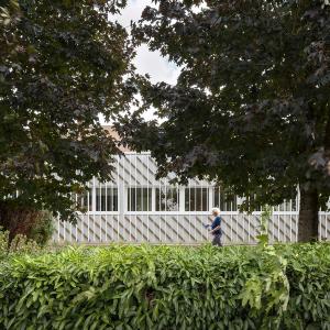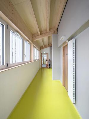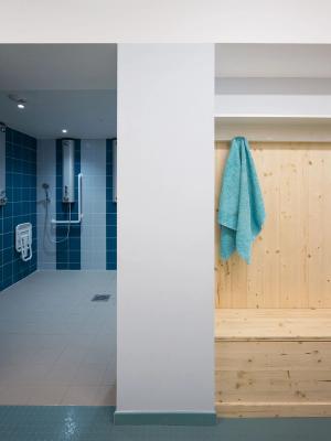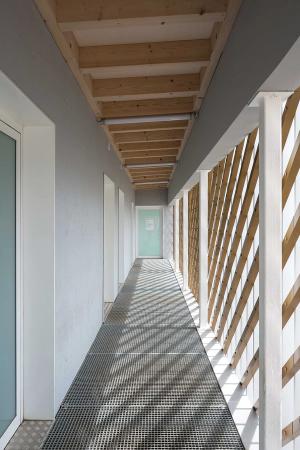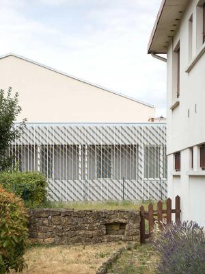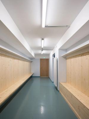 Sur la façade sud, le long du cheminement vers les terrains adjacents, une extension est créée dans le prolongement d’un volume existant pour accueillir des vestiaires supplémentaires. Une circulation extérieure distribue l’espace bureau/rangement, les vestiaires et les sanitaires joueurs. Un dégagement intérieur donne accès aux locaux destinés aux arbitres et au local technique. Ce volume de l’extension respecte la cote de crue définie dans le PPRI. L’ensemble est donc surélevé et desservi par un escalier.