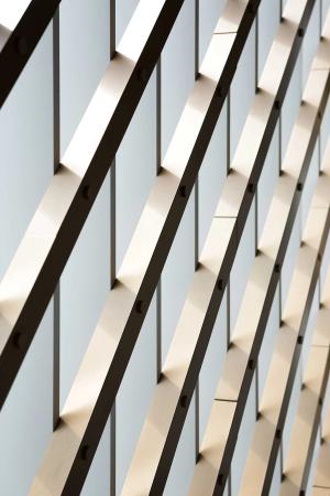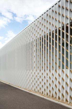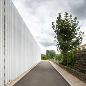 Le bardage, constitué de lames métalliques verticales et à 45°, se prolonge pour former une clôture enveloppante. Cette enveloppe délimite un espace extérieur partagé et intègre les portails. Elle permet de lier les volumes créant ainsi une unité entre les différents volumes qui composent le programme. Le complexe sportif, paré de son nouveau manteau marque l’entrée de la ville de Manom.