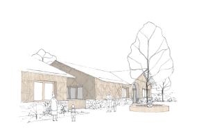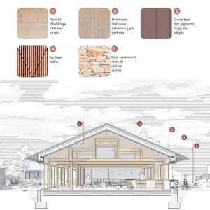 Construit en structure bois et bardé de chêne issu de la forêt local, le bâtiment, avec son socle de pierres sèches, fait la part belle aux matériaux géo et biosources.
