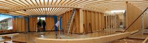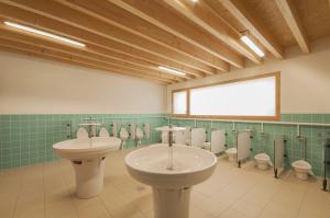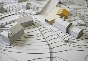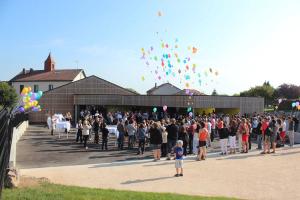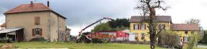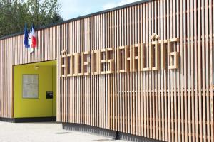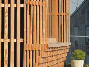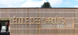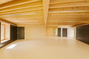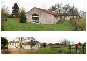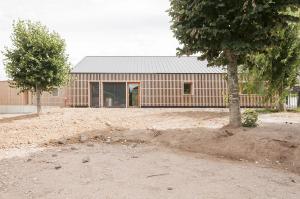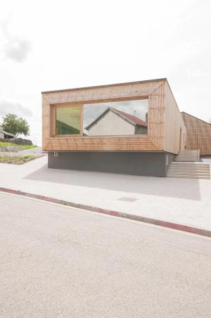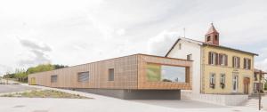 La disposition de la cour et du jardin de même que l’accessibilité directe des sanitaires depuis la cour permettent un usage autonome des espaces disponibles, notamment pour une fête municipale. L’unité d’ensemble est donnée par le bardage de carrelets de douglas verticaux ajourés habillant les façades de l’ancien bâtiment et de son extension. La mise en œuvre répétée du bois dans les aménagements extérieurs et intérieurs provenant de la filière locale contribue par ailleurs à l’intégration dans le milieu rural.