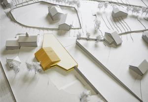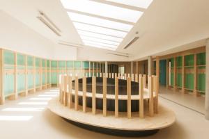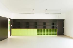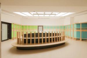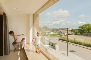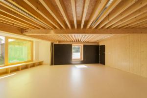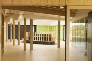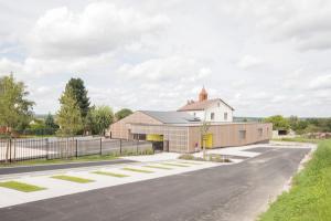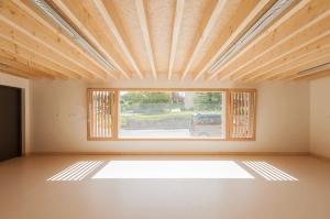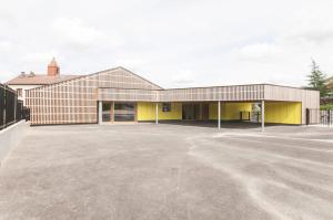 A son extrémité qui surplombe la rue, une large baie offre à la salle de motricité, la plus grande salle du programme, un large cadre sur le village. Un vaste hall intérieur éclairé zénithalement articule cette extension avec l’ancien bâtiment réhabilité.