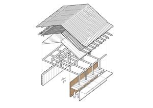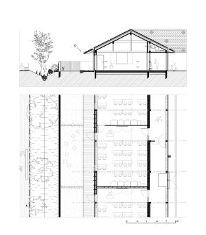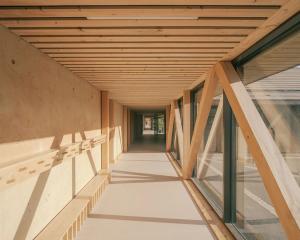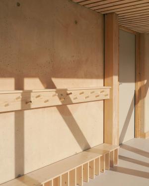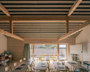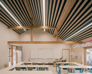 Le volume de la classe s'installe sous le rampant de la charpente en sapin blanc du Livradois-Forez et fait référence à un registre naturel et domestique, cadre intime pour l'apprentissage et les activités des enfants. Chacune ouvre sur un jardin privatif appropriable par les enfants et leurs encadrants : une extension extérieure (cour/jardin) de sa salle pour compléter et offrir de nouvelles pistes d'apprentissage.