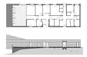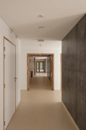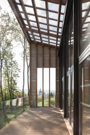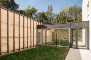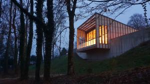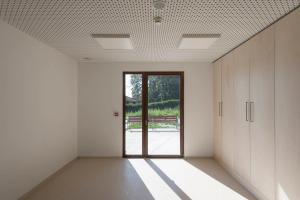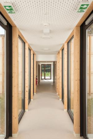 Le bâtiment est implanté dans la pente. Il projette ses occupants vers le paysage proche et lointain. On redécouvre ainsi le petit bois oublié de l’EHPAD et ses grands arbres.