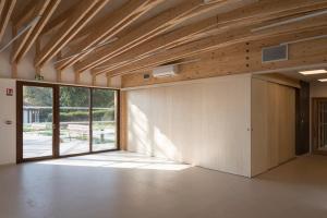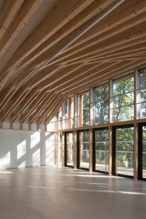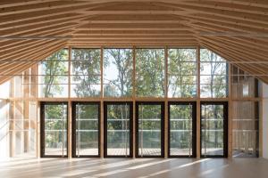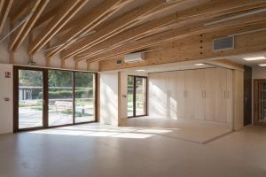 A l’intérieur, la grande salle est couverte d’une charpente qui franchit toute la largeur du bâtiment et se déploie progressivement vers la grande baie