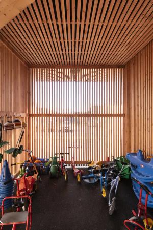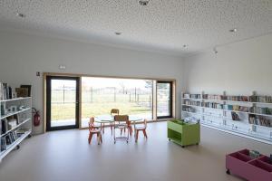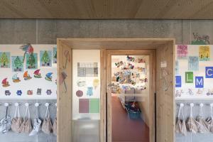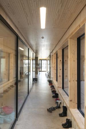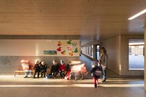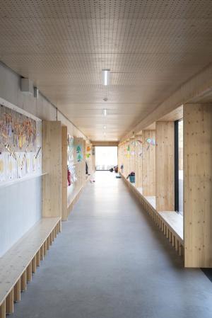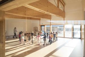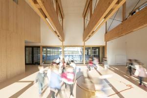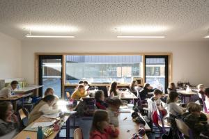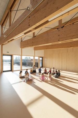 Autour du jardin et en fonction de l’âge de l’enfant, un parcours architectural est un voyage initiatique au cœur du bâtiment. Les différentes orientations des salles de classe permettent aux enfants de se situer dans l’espace et le temps, au fil des années de leur scolarité. L’ambiance de la salle de classe maternelle est différente de celle de l’élémentaire mais elles s’ouvrent toutes largement sur le paysage. Les proportions et les hauteurs varient comme l’enfant grandit. L’organisation sur cour intérieure permet de conserver des vues entre les espaces mais aussi de dissocier clairement les deux pôles. La salle de motricité prolonge le jardin pédagogique vers la cour et permet des vues proches et lointaines, par transparence, sur le paysage. Un maximum de matériaux perméables et drainants seront mis en œuvre sur l’ensemble de l’école.