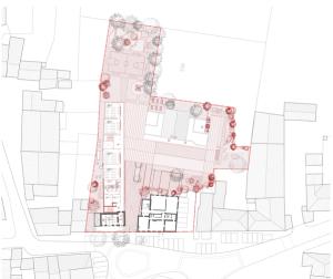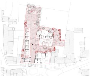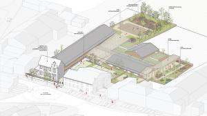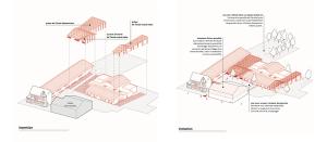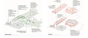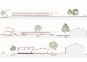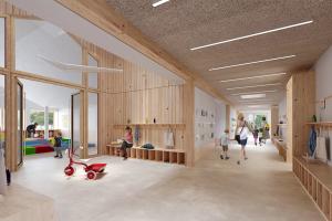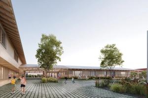 Au cœur de la réflexion, la création d'une entrée commune transforme l'ancien accès contraignant en un véritable "parvis des parents" : un espace paysager, sécurisé et convivial, situé en retrait de la circulation routière. Ce parvis devient un lieu de transition douce qui distribue les flux vers l'école maternelle, conçue comme un cocon protecteur autour d'une "colonne vertébrale" lumineuse, et vers l'école élémentaire, restructurée sur deux niveaux. Les cours sont réimaginées selon le concept de "cours oasis", alternant zones actives et îlots de fraîcheur pédagogiques. Les nouveaux préaux, dotés d'une charpente bois expressive et d'une couverture en polycarbonate, offrent des zones d'accueil lumineuses et qualitatives. Pensé pour la vie de la commune, cet ensemble fonctionnel et modulaire permet également d'accueillir des événements locaux, comme des marchés ou des kermesses, renforçant ainsi le rôle de l'école comme pilier social du territoire.
