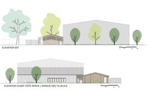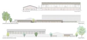 Le futur complexe sportif s’inscrit pleinement dans cette transformation. Symbole de la vie associative etsportive, il doit à la fois apparaitre dans le paysage comme un équipement institutionnel, tout en s’insérantharmonieusement dans le tissu bâti environnant. Pour y parvenir, nous avons décomposé le programme enplusieurs volumes mitoyens, chacun correspondant à une disciplines sportives. Ils apparaissent ainsi clairement par leur forme tout en composant un ensemble architectural homogène. Trois volumes couverts detoiture à deux pans évoquent les grandes halles industrielles disparues et entrent en résonnance avec les