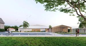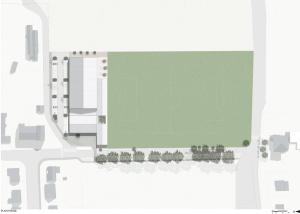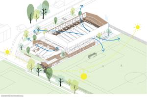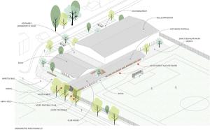 maisons individuelles environnantes.Le bâtiment est conçu comme un outil à destination des sportifs et adapterait facilement à toute sorte d’évènements culturels. Cette forme architecturale qui consiste en une imbrication de plusieurs volumes symbolise son rôle « unificateur ».L’organisation du bâtiment permet une pratique par discipline, en garantissant une certaine autonomie, mais aussi un fonctionnement mutualisé, en permettant le partage et la mise à disposition des locaux entre les différentes disciplines sportives. Cette souplesse de fonctionnement garantie une multiplicité d’usages, peut-être même au-delà du domaine sportif, et d’importantes possibilité d’évolution du bâtiment à long terme.