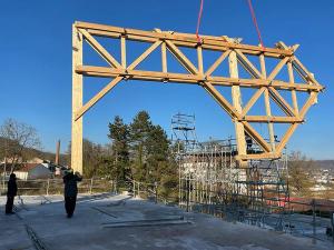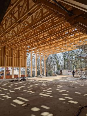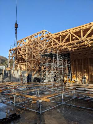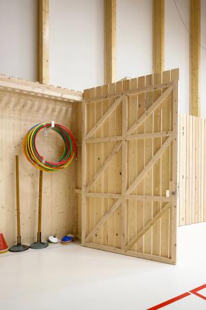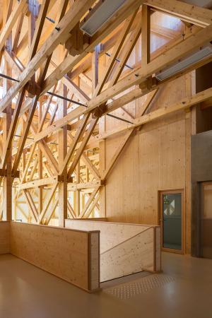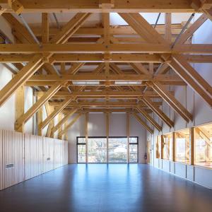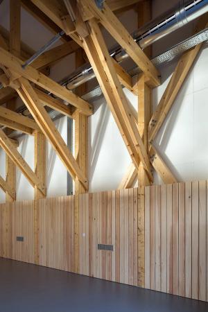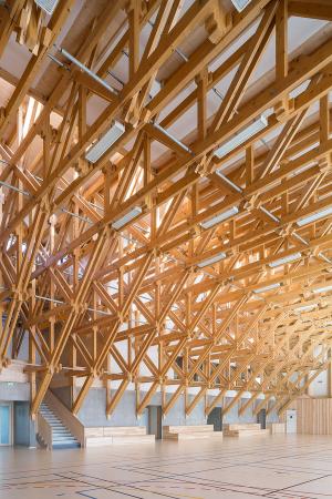 L’édifice est construit en structure bois et repose sur un socle en béton calé dans la pente. Il démontre les capacités d’utilisation du bois local peu transformé en structure, en aménagement intérieur, en menuiserie extérieure et en bardage. Pour franchir 24m de portée avec uniquement du bois massif (de section 20cmx8cm et de longueur 8m), la charpente est composée de 17 portiques formant des poutres treillis moisées. La grille est assemblée à chaque nœud par des connecteurs métalliques traversant de part en part. Les fenêtres sont en pin lasuré de provenance locale. L’ensemble du mobilier : les gradins et les placards de la grande salle, les bancs des vestiaires sont réalisés en structure et planches de bois.