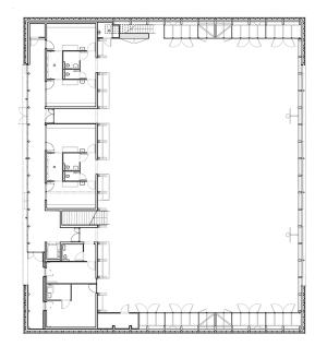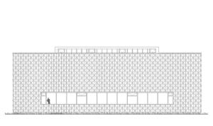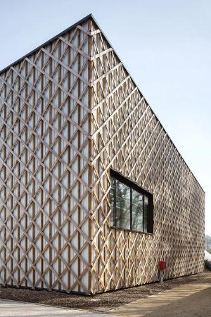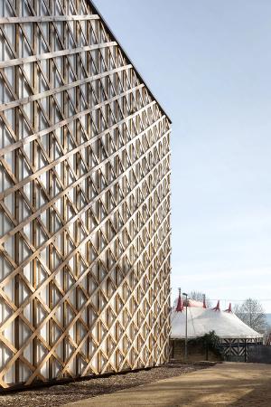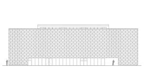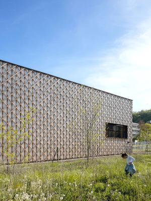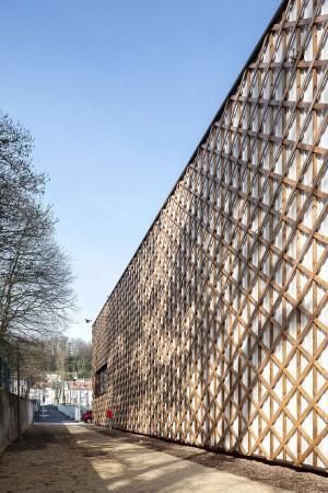 Le bâtiment prend place sur une petite parcelle pentée et exiguë, en contrebas du boulevard de Scarpone, en lieu et place de l’ancien gymnase sinistré en 2012. D’un côté le collège, de l’autre un bâtiment de bureaux, de l’autre une parcelle qui accueillera des logements et à l’arrière le site du Memô, lieu de fabrique artistique et foisonnante. Le gymnase est contenu dans un volume de 32mx36mx12m. La structure et les espaces sont organisés selon une trame de 2mx2mx2m. L’enveloppe extérieure est habillée de grandes planches de Douglas signifiant le motif en résille de la charpente intérieure. Chaque façade propose une seule et grande ouverture. Le plan est composé d’une bande de service latérale (vestiaires, sanitaires, bureaux) surplombée de deux petites salles de sport, en mezzanine et en lien visuel avec la grande salle principale. Un édicule en toiture offre deux grandes ouvertures en bandeau qui apportent lumière et ventilation naturelle au cœur du bâtiment.