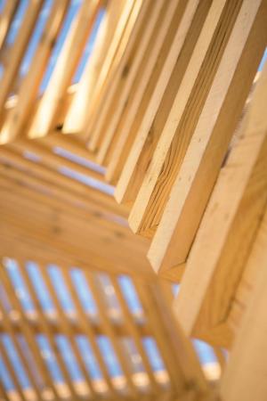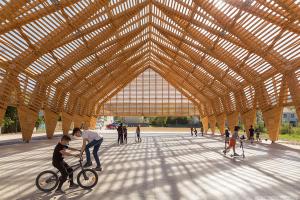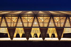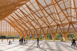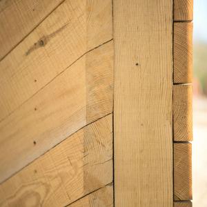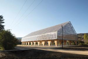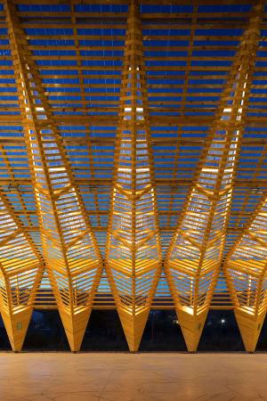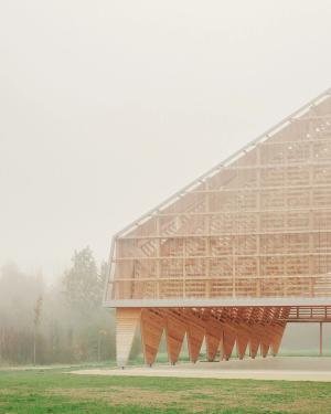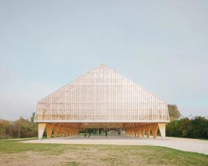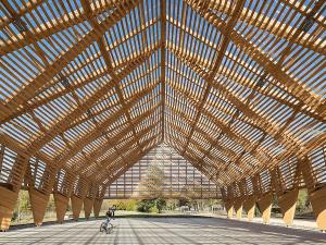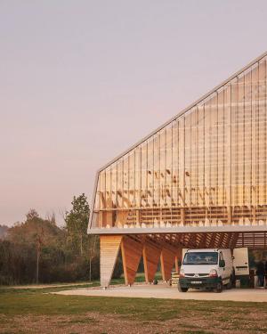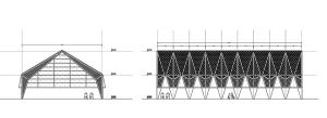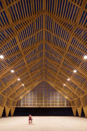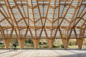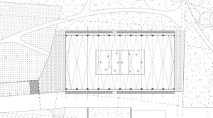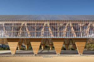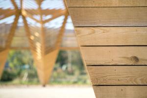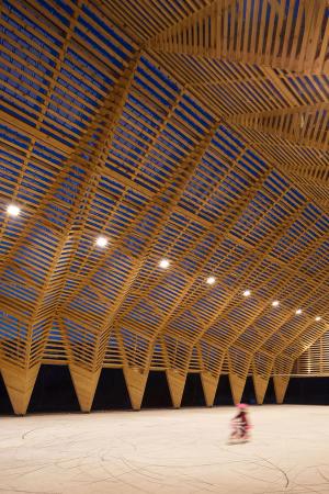 La structure primaire est en douglas lamellé collé. Le bardage et le voligeage sont en pin noir issu des forêts communales.La couverture est réalisée en fines plaques de plexiglas transparent. Cette couverture se prolonge à la verticale pour habiller les façades jusqu’à une hauteur de 3m.