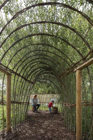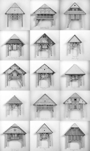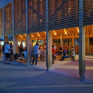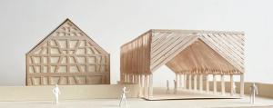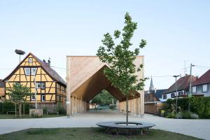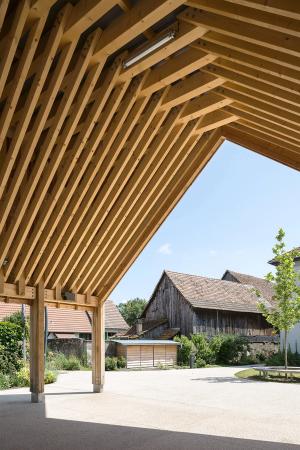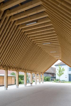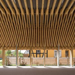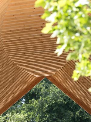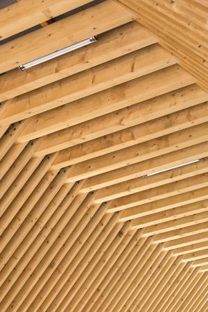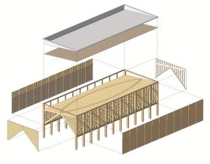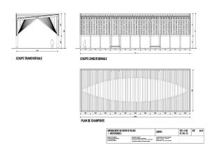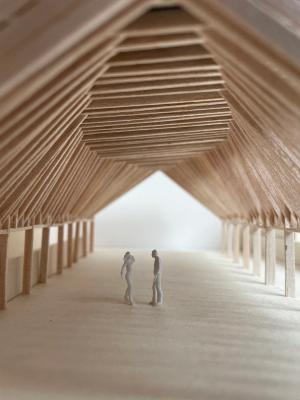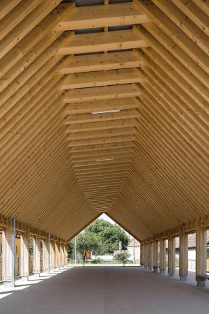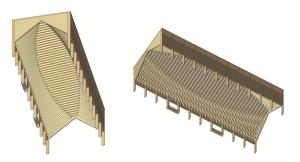 Les contrefiches se décalent progressivement pour former cette volumétrie enveloppante, à la manière d’une coque de bateau renversée.
