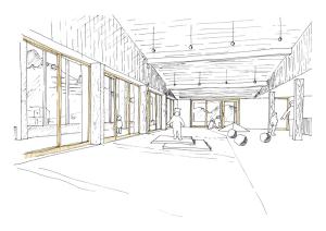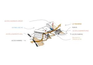 La traverse, rue intérieure, permet de distribuer les halls, la crèche, les parkings.