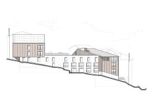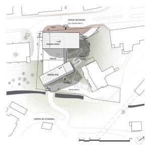 - volumétrique : scinder une opération d'envergure en deux bâtiments aux volumétries sages, pour suivre la pente, limiter les terrassements ravageurs, en implantant la crèche publique, en articulation des deux bâtiment