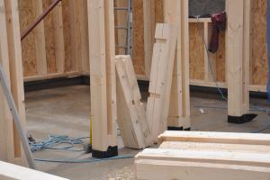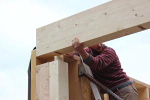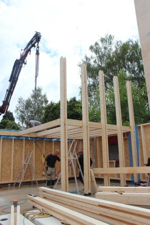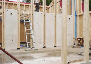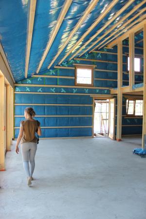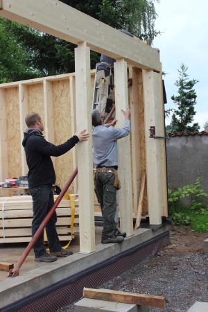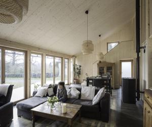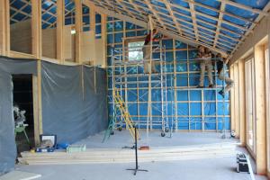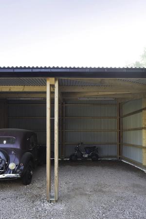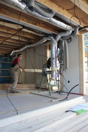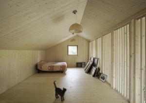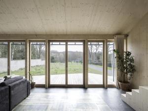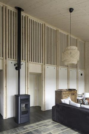 Le placo n’existe pas. Il est remplacé par des panneaux bois en épicéa. L’inertie est renforcée par la chape et les voiles de béton incrustés dans la structure poteau poutre intérieure. L’enveloppe est isolée en quantité à partir de matériaux sains : ouate de cellulose (20cm en murs, 26 cm en toiture) et complément en fibre de bois (6cm en murs et en toiture). Une VMC double flux au cœur du petit volume permet de ventiler très simplement l’ensemble des pièces. Le chauffage est assuré par un poêle à granulés bois en position centrale.