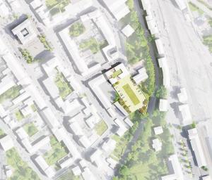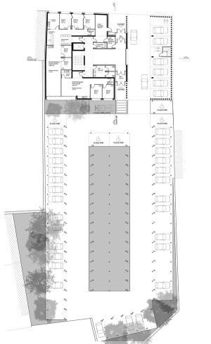 Notre implantation libère la quasi totalité de la parcelle pour le grand parking de 85 places nécesaire au fonctionnement de la maison de santé. Mais ce vide pourra peut être un jour devenir une dilatation ou une entrée vers les berges réaménagées de la Crusnes. Et pourquoi pas offrir le lieu d'un nouveau franchissement piéton de la rivière qui mettrait en place un lien direct entre la gare et le centre ville ?