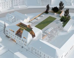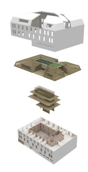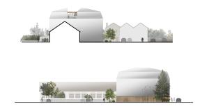 La composition de la toiture a une grande importance dans l'architecture de notre projet. La mise en place de vides (les 3 terrasses) offre une relecture de la massive et traditionnelle toiture mansardée. Ces vides redonnent aux pleins une échelle humaine, quasi domestique et dessinent sur ce toit 3 petites « maisons » clairement identifiables :