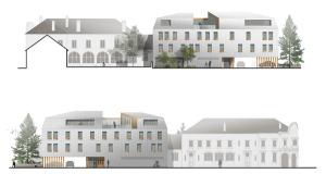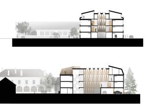 Nous avons donc choisi d'organiser notre bâtiment sur 4 niveaux : 3 étages classiques et le dernier niveau réparti dans la toiture à la manière d'un comble mansardé. La typologie du « mansard » nous est apparue comme évidente etparfaitement ancrée localement au regard des constructions existantes dans le centre ville de Longuyon.