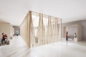 Cette ponctuation commence ainsi à suggérer l'étonnante intériorité. Car au cœur de la masse se trouve quelque chose qui balaye toutes les références habituelles du milieu médical : l'Atrium et la présence affirmée de matériaux brut et nobles: le bois et le béton.