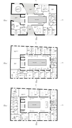 fluidité et proximité des circulations : moins de couloirs, moins de distance à parcourir. La compacité du plan permet de réunir toutes les circulations au cœur de l'édifice et créer ainsi une véritable centralité où chaque praticien se trouve à moins de 15m de la distribution verticale : (ascenseur et escalier)
