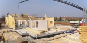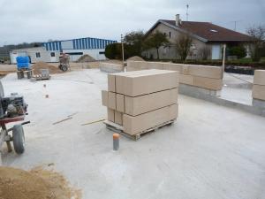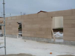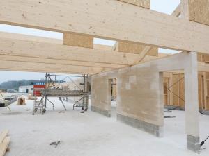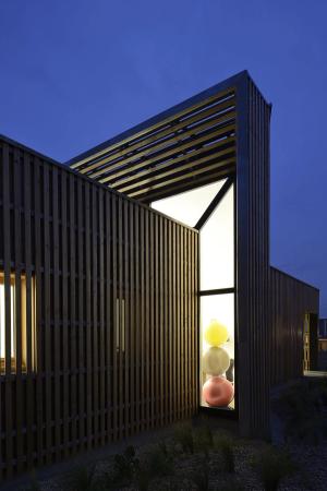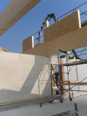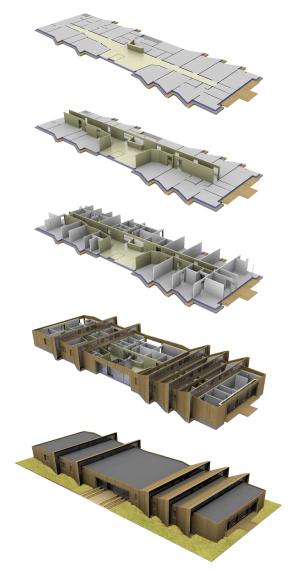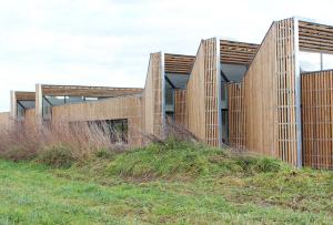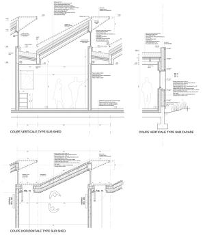 Le projet met en œuvre une structure mixte : l’enveloppe est réalisée en ossature bois, fortement isolée alors que le mur de refend intérieur est en pierre calcaire locale (pierre savonnières). Les poutres primaires en lamellé collé portent sur trois appuis : les deux murs longitudinaux en bois et le mur central en pierre. Le bardage est un tressage en 3 couches: deux épaisseurs de lames de mélèze verticales de 6cm disposée en quinconce et écartées par une lame d’acier galvanisé horizontale. Ce système procure de l’épaisseur au dispositif de bardage sans risquer de trop exposer le pare pluie. Les jeux d’ombres et de lumière animent cette façade et les ponctuations brillantes des lames métalliques contrastent l’aspect mat des lames de bois qui griseront au fil des années.