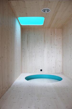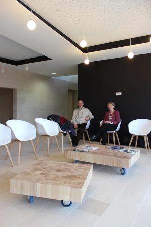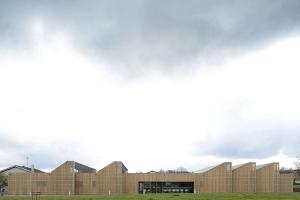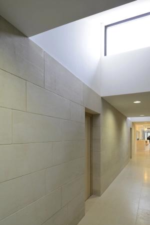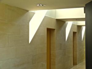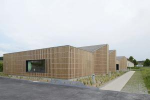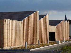 Les matériaux naturels sont mis en scène : le bardage bois habille entièrement l’enveloppe extérieure (façade et plans inclinés des sheds) alors que la pierre offre aux espaces intérieurs une sérénité rassurante au vu de la fonction de l’édifice.