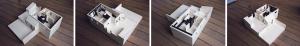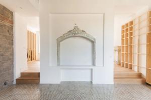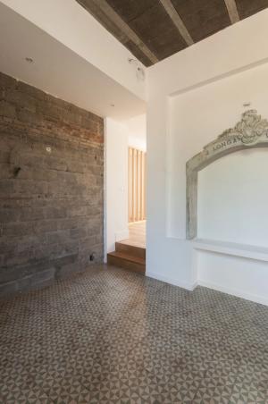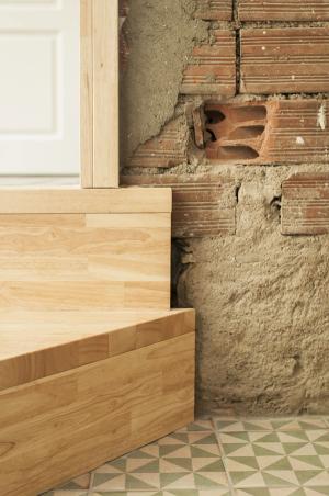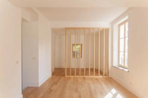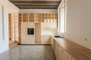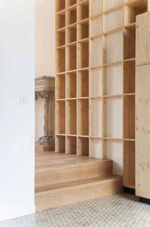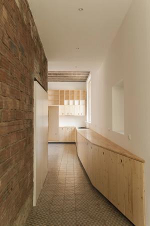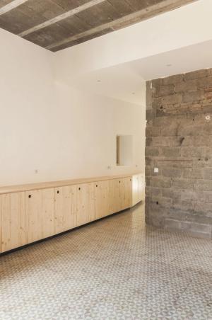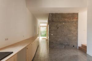Notre projet est une fouille archéologique, une multitude d'interventions contextuelles qui dialoguent avec des anecdotes existantes. Cette maison fut dans le passé occupée successivement par deux artisans créateurs : un sculpteur et un ferronnier qui n'ont certes pas révolutionné l'histoire de l'art mais qui se sont bien amusés à parsemer leur logis d'interventions diverses et variées. Accolé à la maison se tenait l'atelier : un foutoir sans nom, une accumulation de strates, de matériaux de diverses époques. Cet atelier est réintégré à la partie habitable, le mur tombe, il est en lien avec le séjour et accueillera une belle et grande cuisine. Un grand meuble en 3 plis épicéa devient le fil d'ariane de la séquence entrée / cuisine / séjour.