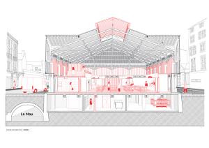 La reconfiguration totale des étals permettra d’abriter un pôle « gourmand », où les Châlonnais pourront déguster des produits du terroir préparés sur place. Une démarche de réemploi du mobilier existant est réalisée. Des dispositifs légers de fermeture des parois permettront d’augmenter considérablement le confort thermique et acoustique, en cohérence avec la faible capacité structurelle de l’édifice.