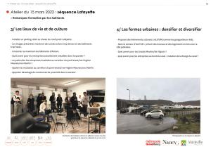 Les temps de concertation ont été décomposés selon quatre secteurs du nord au sud : le quartier Lafayette, le quartier du sentier du dimanche, le secteur Alstom et le secteur des Grands Moulins. Selon le site, la forme des ateliers a été adaptée pour répondre au mieux aux enjeux et engager la concertation de manière efficace : conférences numériques, balades urbaines, discussion et échange d’idées par petit groupe, restitutions collectives sur plan, etc.