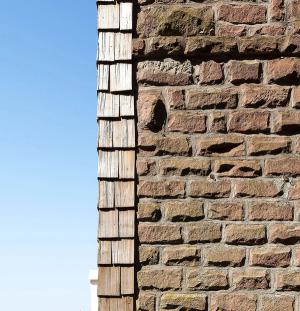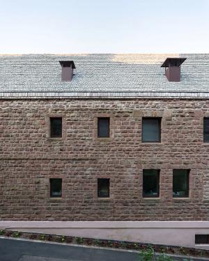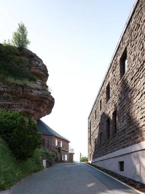 La façade arrière en grès rose des Vosges, la mieux conservée, est laissée visible, valorisée par son dialogue avec la roche voisine.