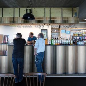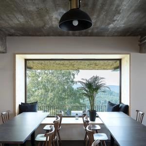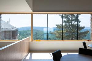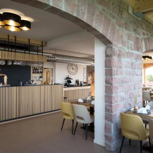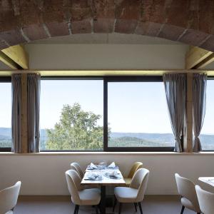 Profitant de la déclivité du site, restaurant et bar disposent d’accès directs à des terrasses dédiées, ainsi que de larges ouvertures sur le paysage. Dans la salle de restaurant, le mur de grès rose rappelle la volumétrie originelle et entretient un dialogue fort avec le grand paysage.