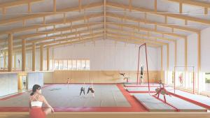 Le bâtiment se pose en rotule des équipements sportifs alentours, et ouvre de nombreuses possibilités d’interaction entre les différentes disciplines sportives.
