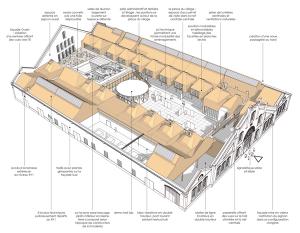 La nef centrale est vide, aérée et met en lien tous les espaces. Elle accueille les espaces d’exposition, le « demotestlab », le jardin intérieur et les espaces de convivialité.